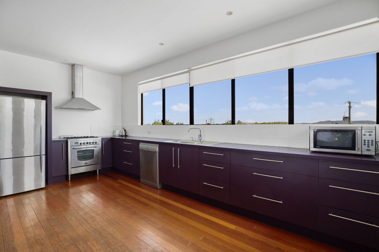 The top level features a spacious open-plan kitchen, dining, and living area, with an east-facing balcony offering beautiful breezes and a glimpse of the ocean. The kitchen includes a dishwasher, large fridge, and a generous gas oven and cooktop. Enjoy views of the Sunshine Coast Hinterland from the kitchen windows, along with stunning sunsets while preparing meals.