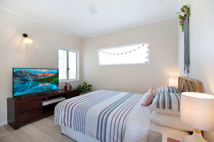 Bedroom 1 Queen, Ensuite, air con, ceiling fan, wardrobe + TV