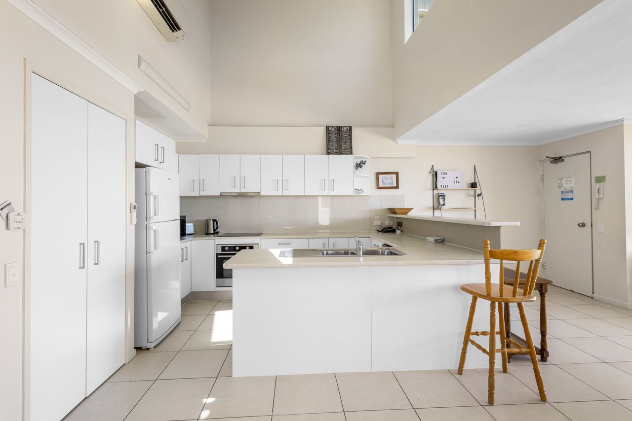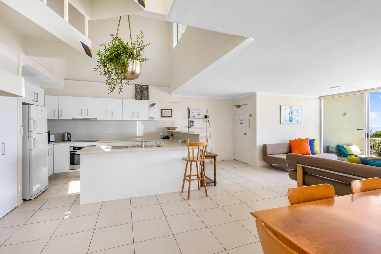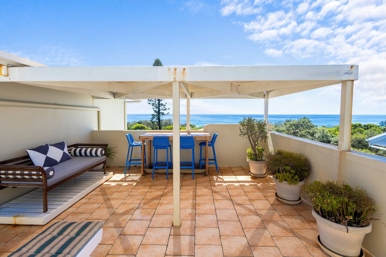 The apartment features two generous bedrooms and a light-filled open-plan living, dining, and kitchen area that flows effortlessly onto a spacious east-facing balcony—perfect for catching the sea breeze and enjoying relaxed outdoor meals. A private spiral staircase leads to your exclusive rooftop deck, where sweeping ocean views create the perfect setting for sunset drinks or stargazing under clear coastal skies.
