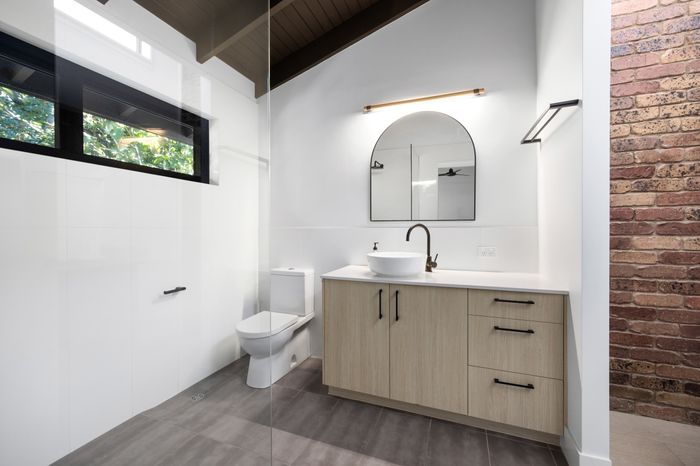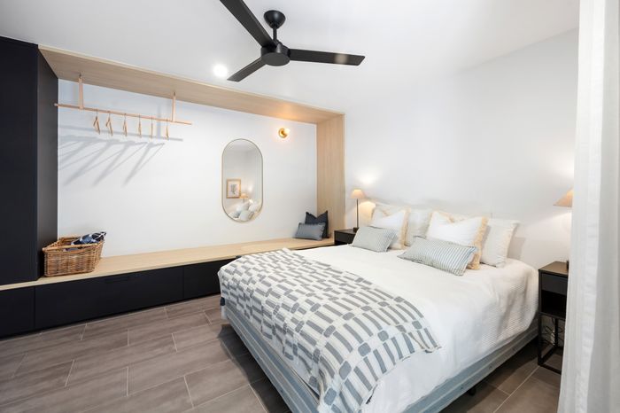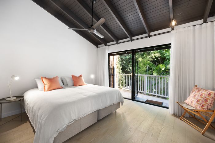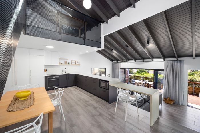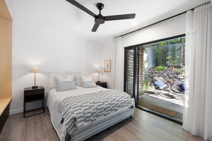 The townhouse features two beautifully appointed bedrooms. The master bedroom boasts an exclusive upper deck with leafy views and an ensuite, while the second bedroom opens onto a secluded rear courtyard, accompanied by a bathroom/laundry combo. A sleek, modern kitchen with integrated appliances, a cozy mezzanine study area, dining space, and a sunken lounge that extends onto the front timber deck complete the interior.