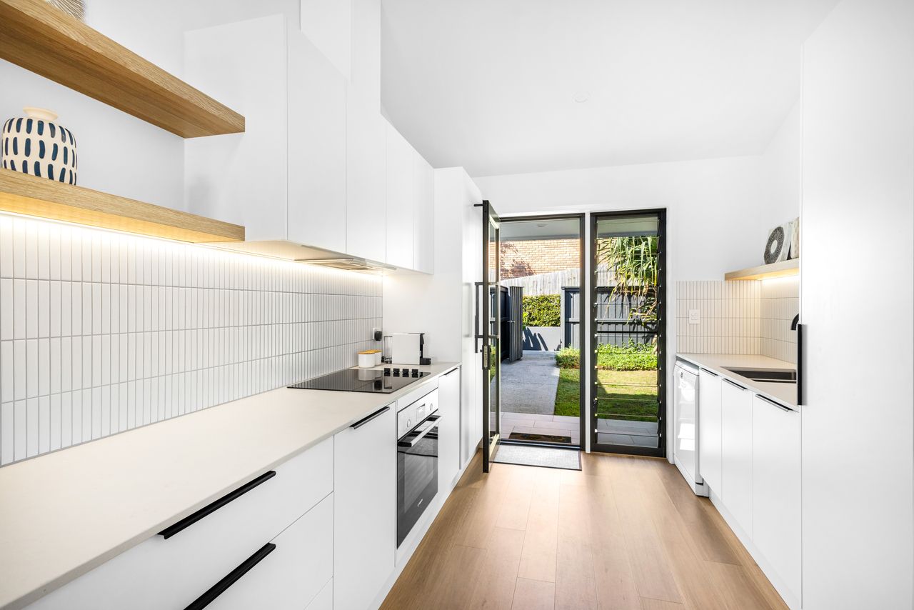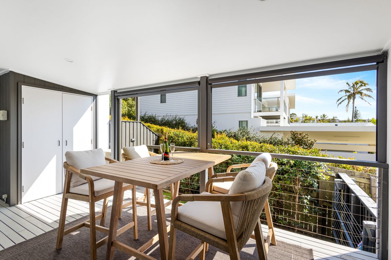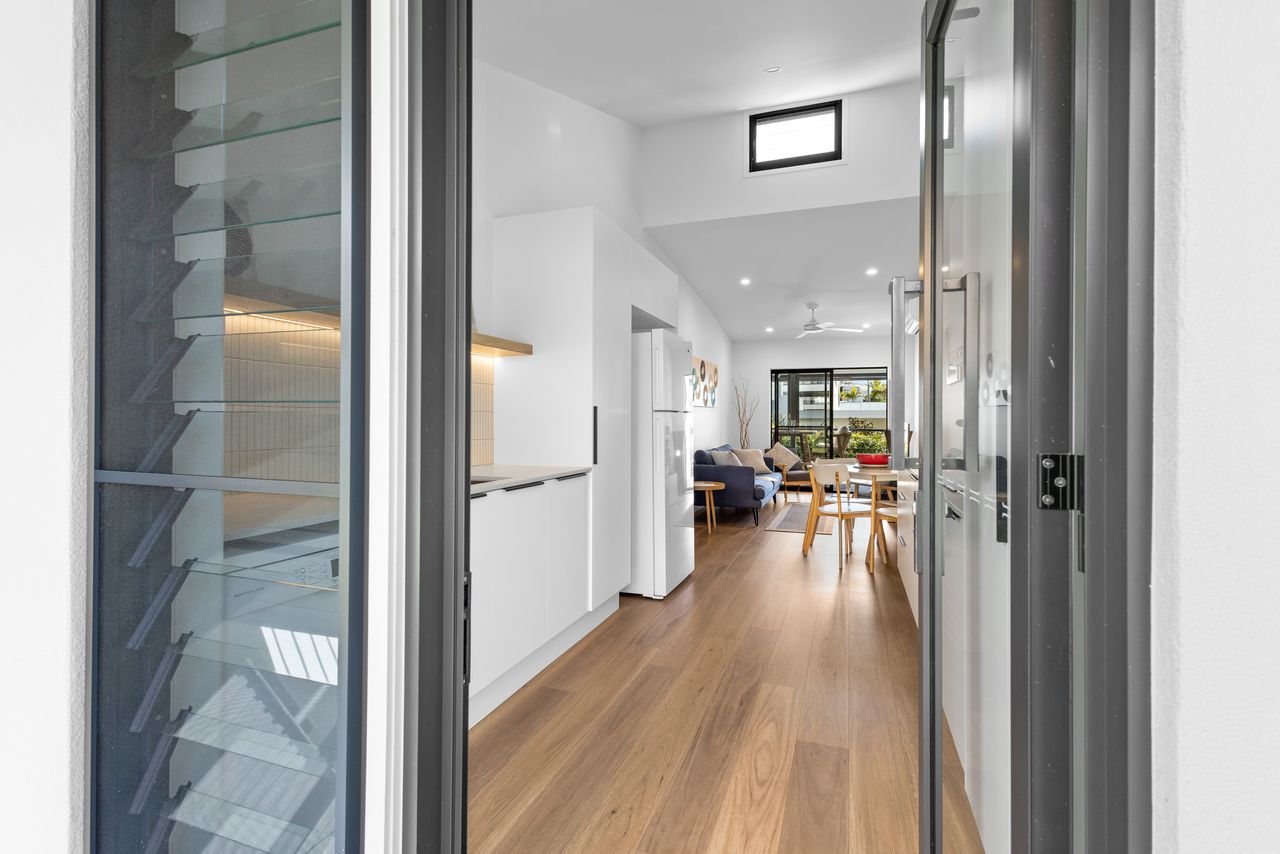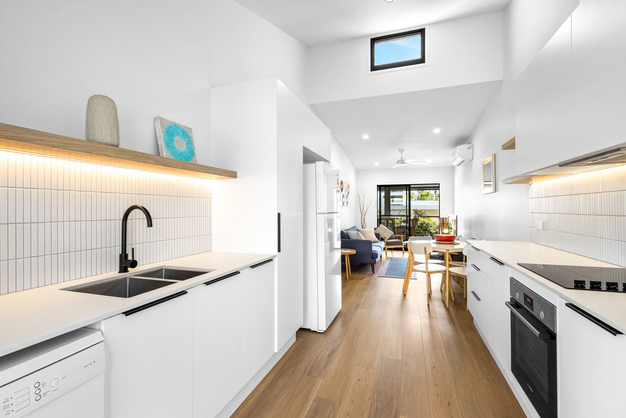 Designed for relaxation and convenience, this two-bedroom unit boasts a north-facing sheltered deck with sea views, the perfect spot to unwind. A private fenced courtyard with charming gardens welcomes you at the entry, while the modern galley kitchen is equipped with premium Bosch appliances and stone benchtops. The open-plan living area flows seamlessly to the outdoor deck, creating a light-filled, breezy atmosphere.