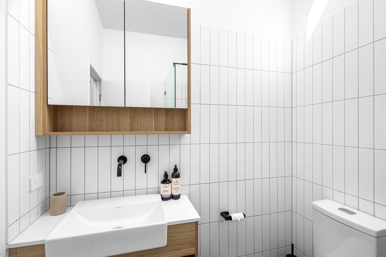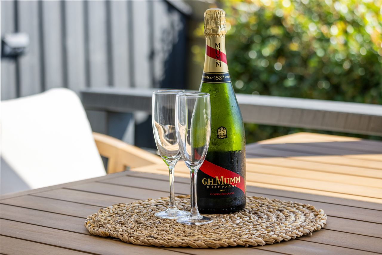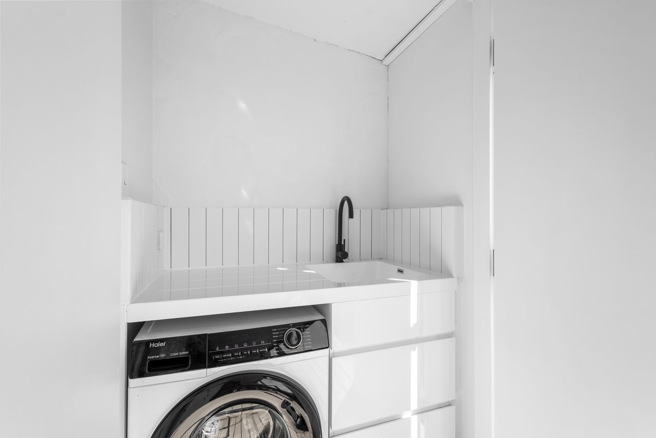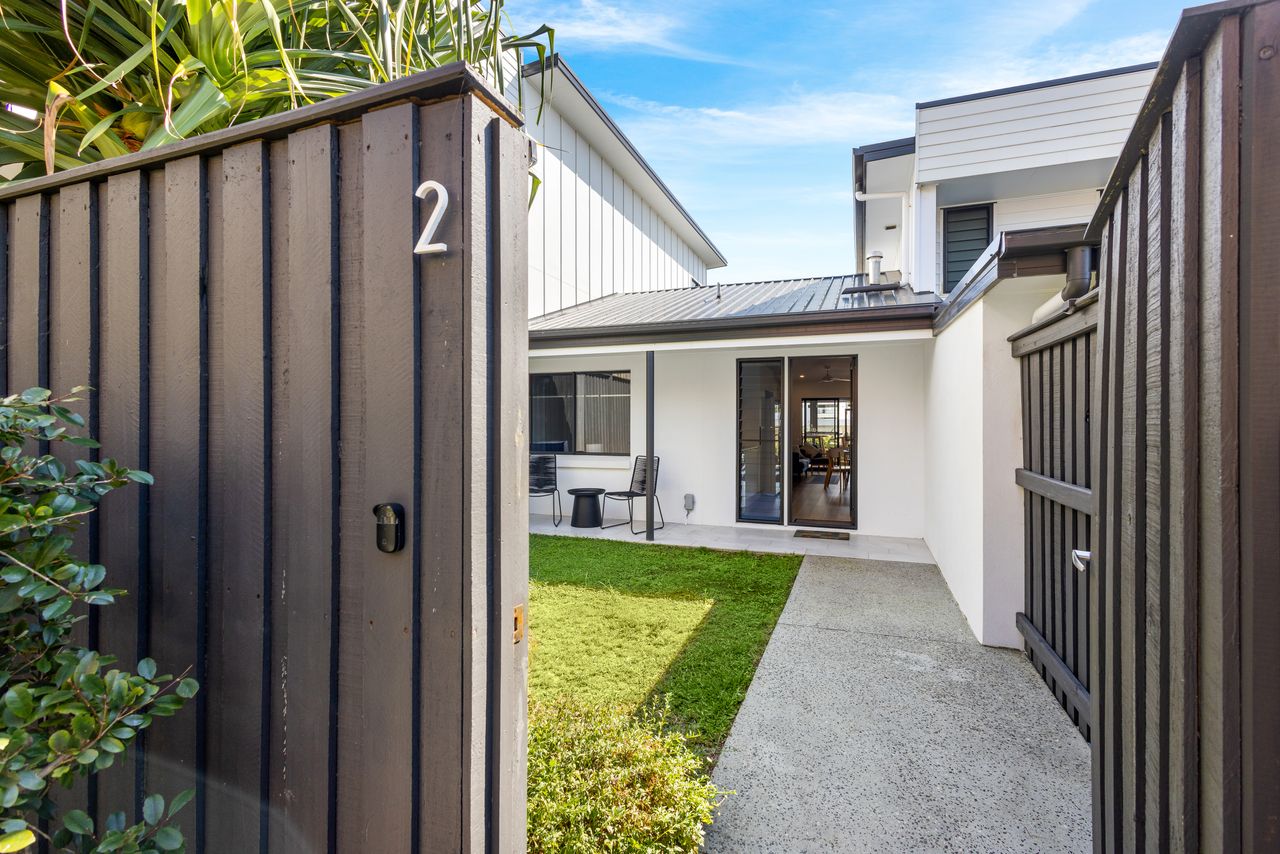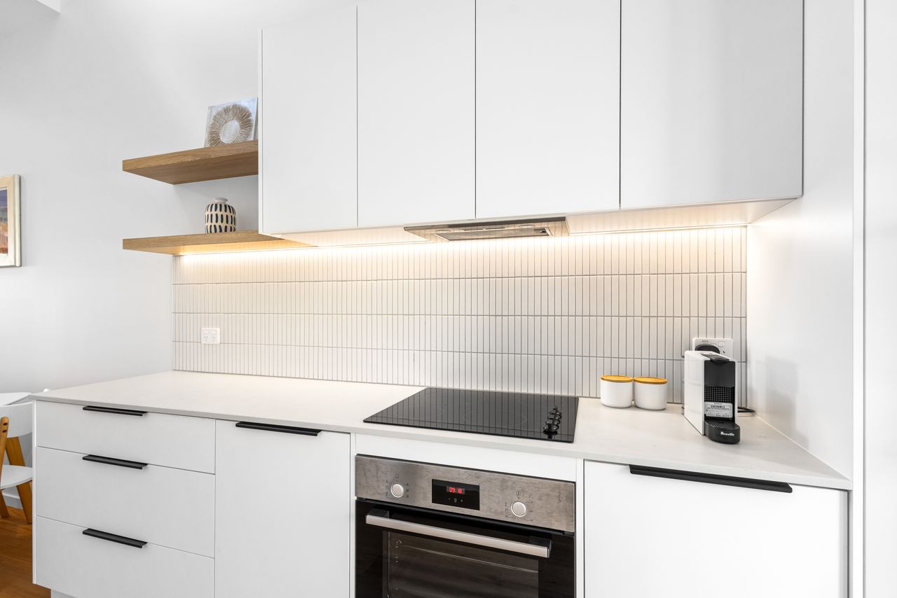 Designed for relaxation and convenience, this two-bedroom unit boasts a north-facing sheltered deck with sea views, the perfect spot to unwind. A private fenced courtyard with charming gardens welcomes you at the entry, while the modern galley kitchen is equipped with premium Bosch appliances and stone benchtops. The open-plan living area flows seamlessly to the outdoor deck, creating a light-filled, breezy atmosphere.