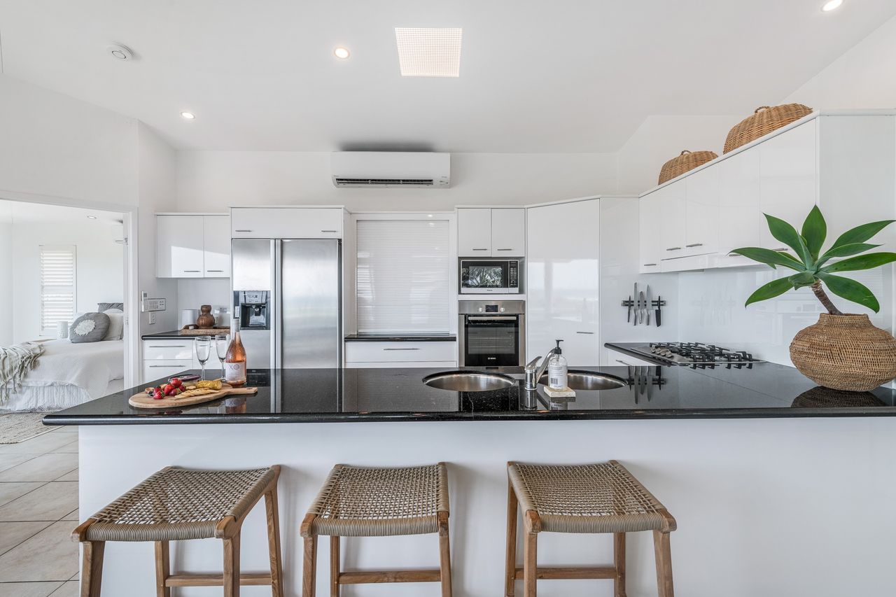 The ground floor offers two generous bedrooms opening to a flat lawn and terrace, complete with outdoor shower and cubby for the kids. Upstairs, the master suite boasts panoramic ocean views, a private ensuite, and access to a terrace made for whale-watching by day and star-gazing by night. A sleek, fully equipped kitchen makes entertaining effortless, whether it’s a casual family meal or a romantic dinner under the moonlight.